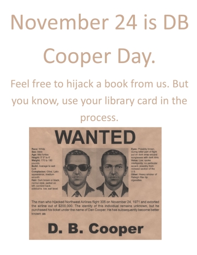 And since DB Cooper perpetrated his plane-jacking the evening before Thanksgiving, the Quincy Public Library will have a display featuring materials about DB Cooper, plane-jacking, & hijacking during the week of Thanksgiving. Just a little something different - both for the library & for those of us trying to escape the holiday related stress. Feel free to borrow any of those. If you don't find what you want, we can always place a hold for you. (But please bring your library card to obtain the materials. No one wants to join DB Cooper on any of those lists. 😒)