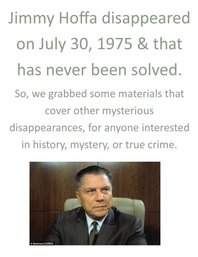 The pictures included are the flyers from our recent displays on Jimmy Hoffa & the Camden 28. If you would like books or dvds about Jimmy Hoffa, the Camden 28, organized crime, trade unions, or activism, feel free to contact the library by calling 217-223-1309 or by emailing reference@quincylibrary.org. We can get you materials on any of those topics or the topic of your choosing.