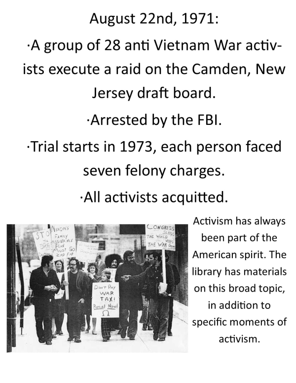 As for the Camden 28, this a group described as "leftist, Catholic, anti-Vietnam War activists." They planned & then executed a raid on the Camden, New Jersey draft office. The group of 28 stole documents from the draft office, with the intention of either removing the documents from that location or destroying the documents. They were outed by one of the group to the FBI. The Camden 28 were arrested during the raid & went to trial. All 28 were found not guilty. Did the Camden 28 go to far? Or was this governmental overreach in reaction to protest?